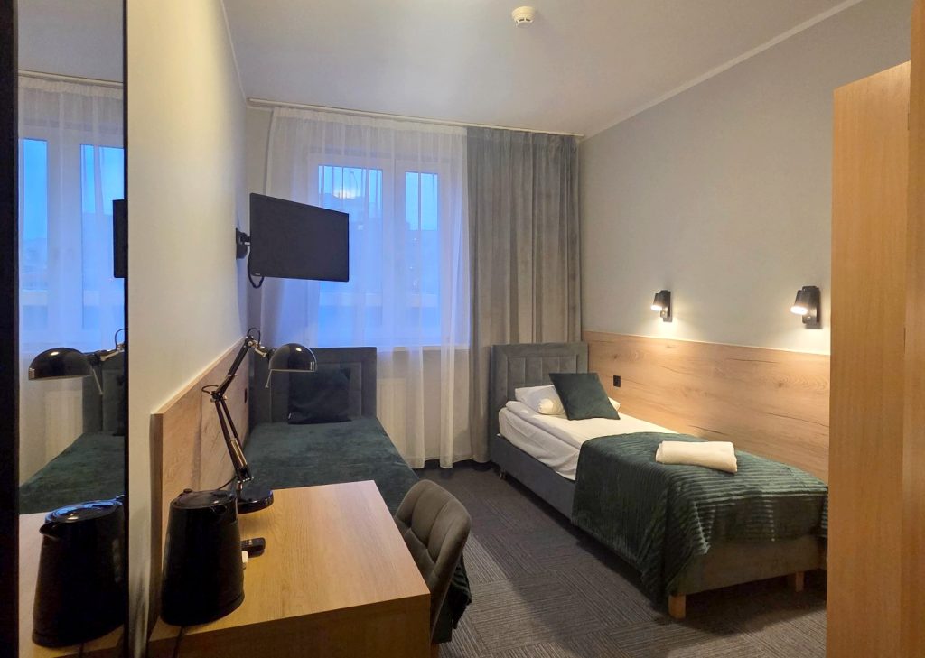 Standardowo wyposażony pokój dla 2 osób (2 osobne łóżka). Pokój jest klasycznie urządzony w cieplej kolorystyce. W cenie pokoju Internet WiFi bezpłatny w całym hotelu. Bezpłatny, obszerny parking.